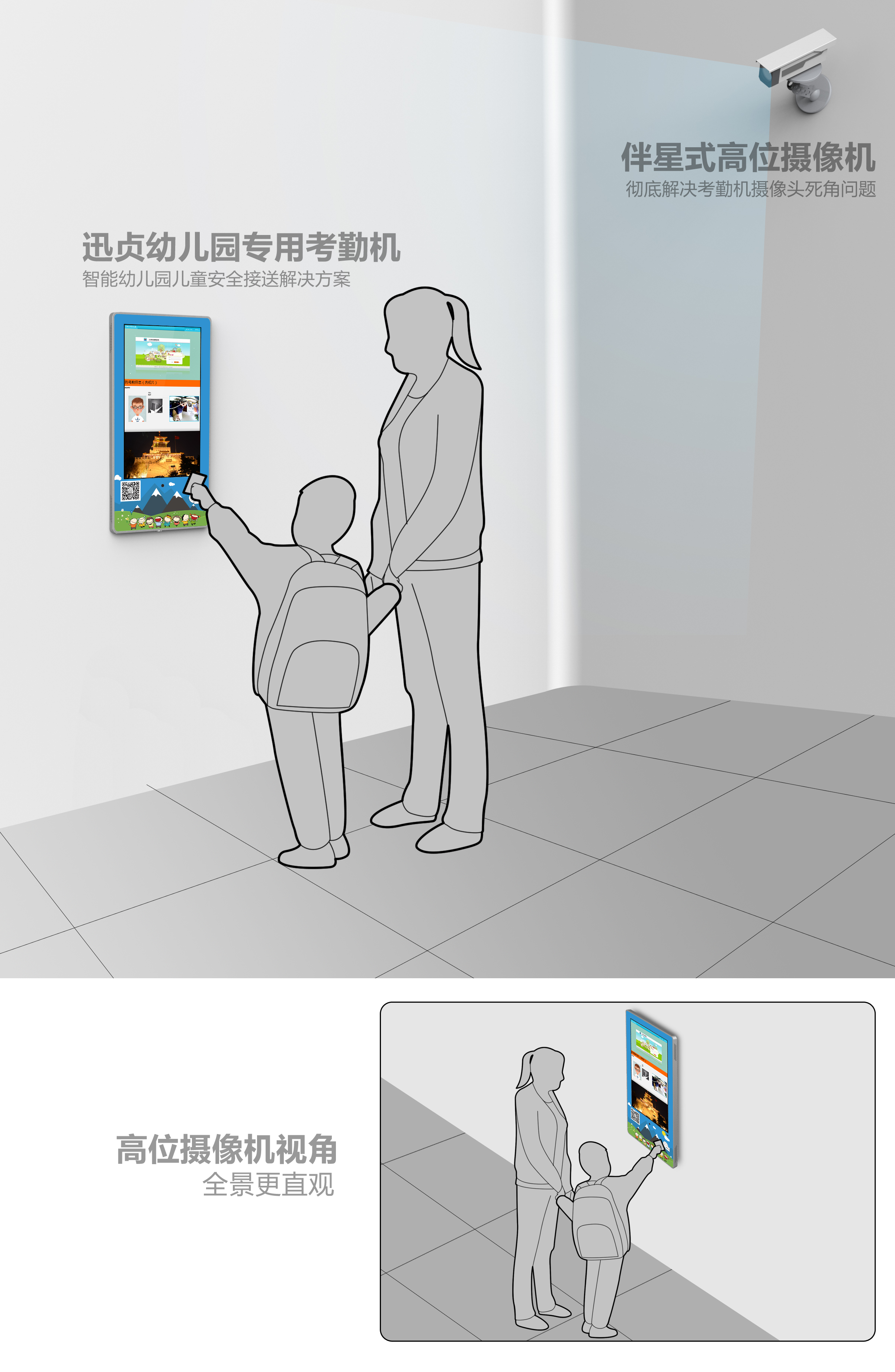 > 解决传统考勤机摄像头,拍摄角度不正且不清晰的问题。迅贞伴星系列