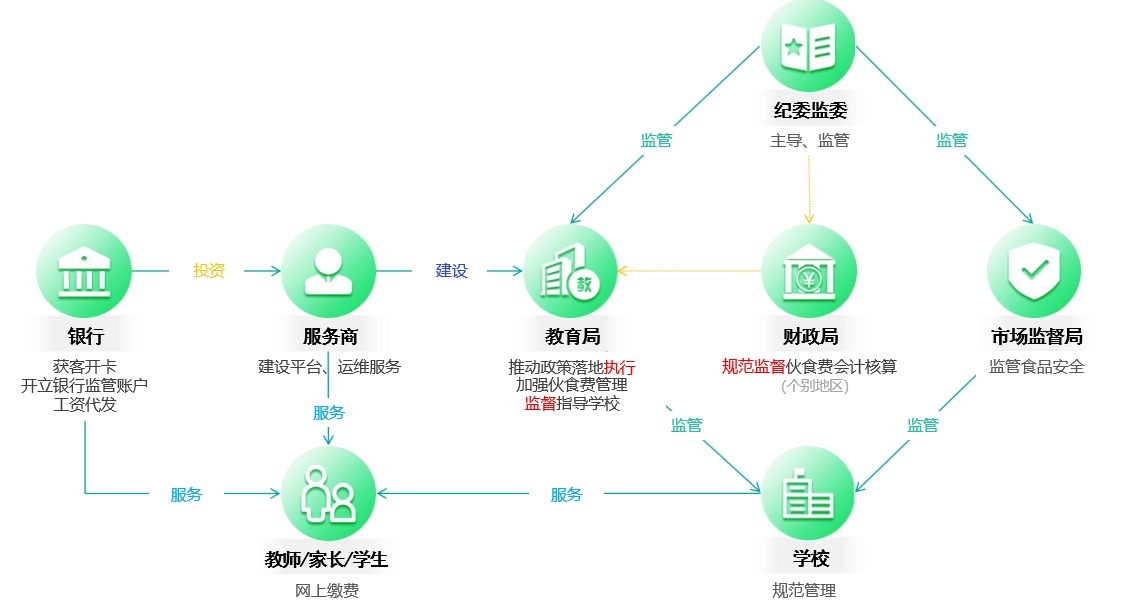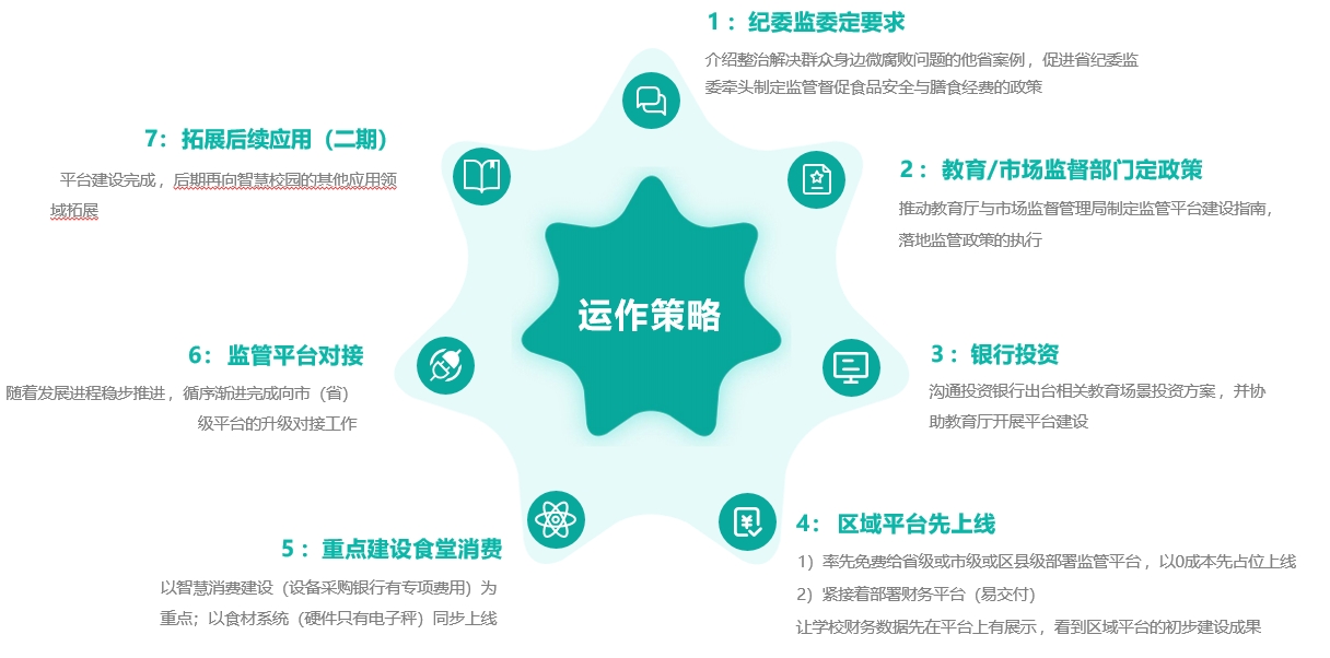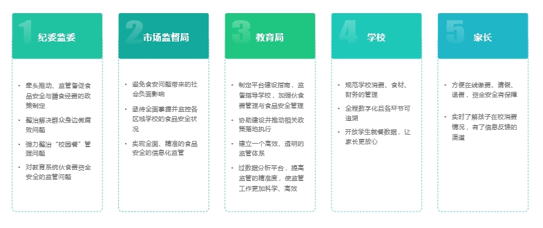 ● 监 管 平 台 : 从 食 堂 经 营 活 动 中 的 “资金、 食材、 账目”等核心要素和 “消费、 采购、 报销”等关键环节实 行全流程、 多方位、 高质效管理