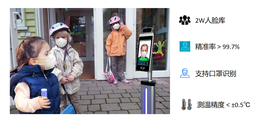 搭载高精准红外热成像测温模块,支持人体温度检测、温度显示,1米超远体温检测,测温精度小于±0.5℃,测温范围10℃~42℃,支持体温异常自动报警,秒级检测速度,并支持测温数据溯源。